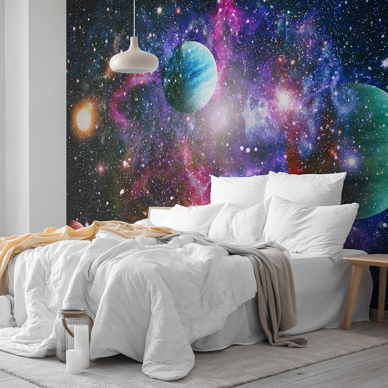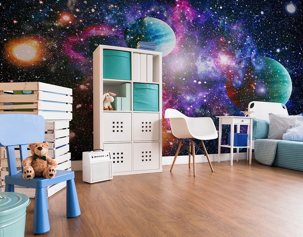 Наклеивайте на стену в очерёдности указанной на этикетке. Приложите фрагмент к стене и аккуратно разгладьте, выровняв и отцентрировав полотно по разметке. Для разглаживания рекомендуется использовать прижимной резиновый валик для обоев. Остатки клея удалите влажной тканью, излишки полотна срежьте острым ножом по линейке. Не допускается использование металлических и пластиковых шпателей! Следующий фрагмент наклейте встык. Аккуратно разгладьте стыки полотен без сильного нажима и трения, чтобы не повредить края.Фотообои K-070 "Большой космос" 400х270 - Характеристики