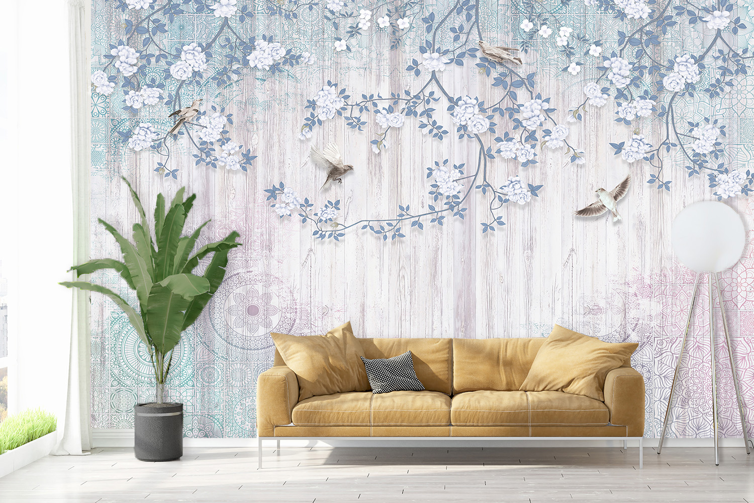 Описание Фотообои Z-379 "Цветущие деревья на деревянном фоне" 400х270
