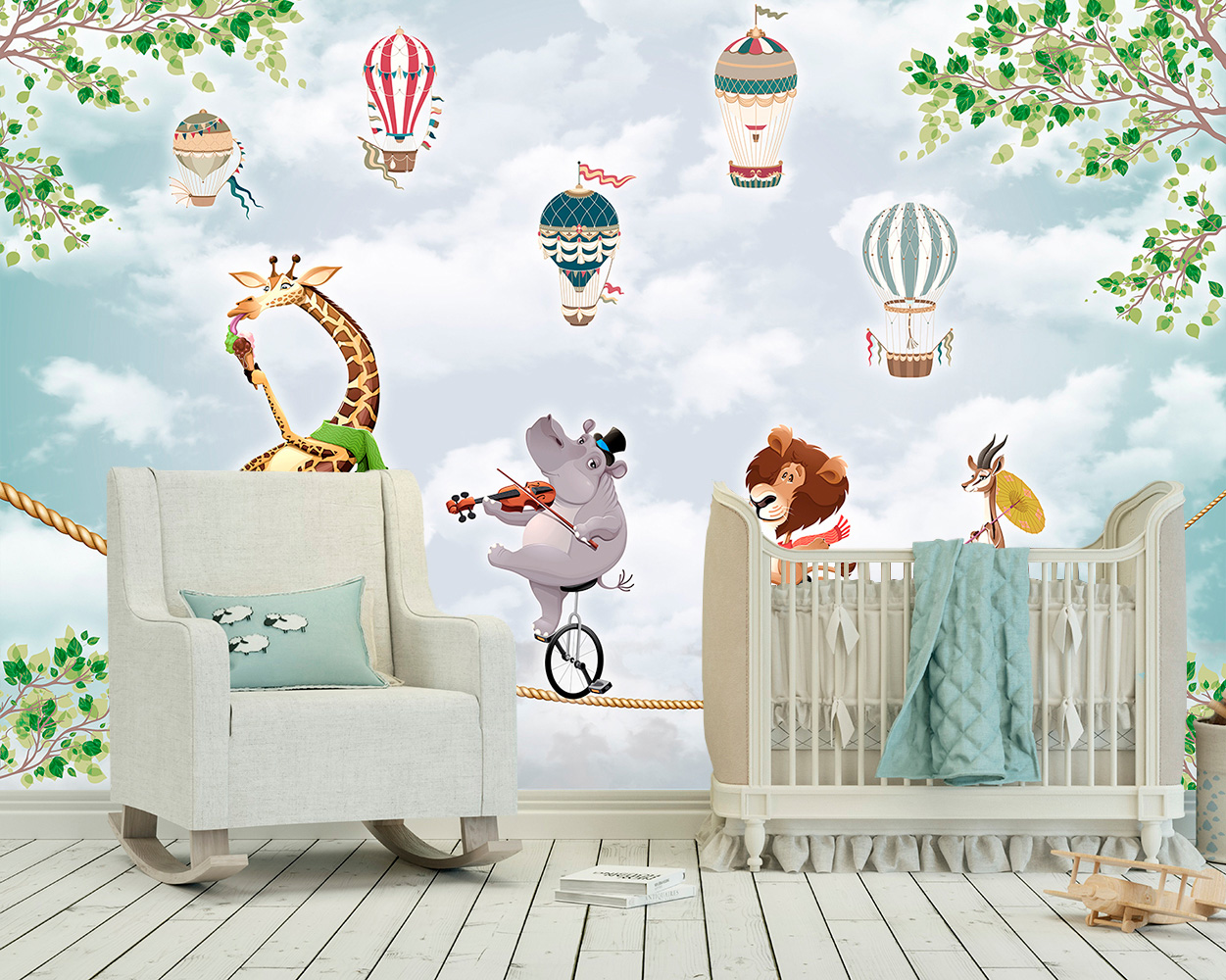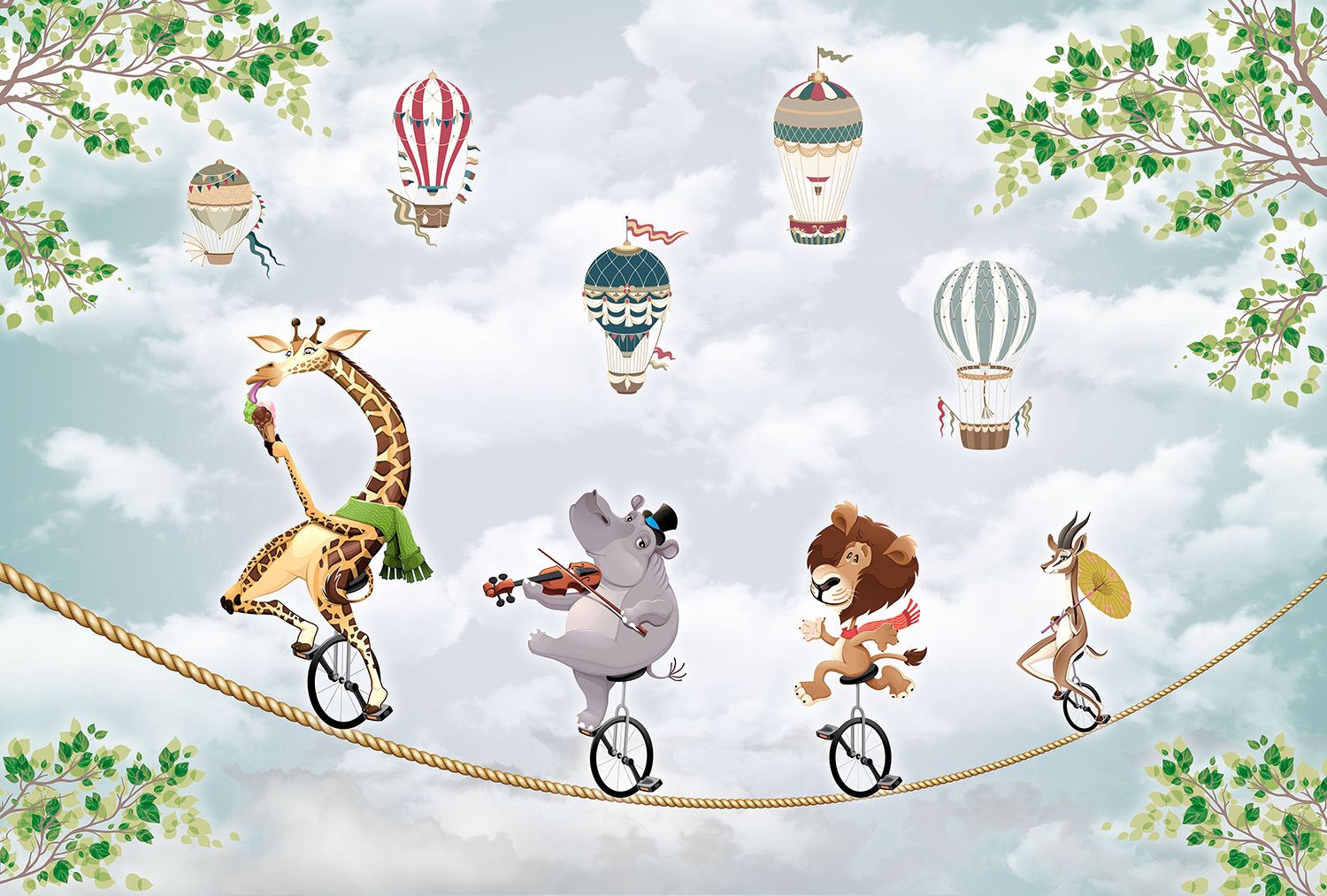 Описание Фотообои F-084 "Животные на велосипедах в небе" 400х270