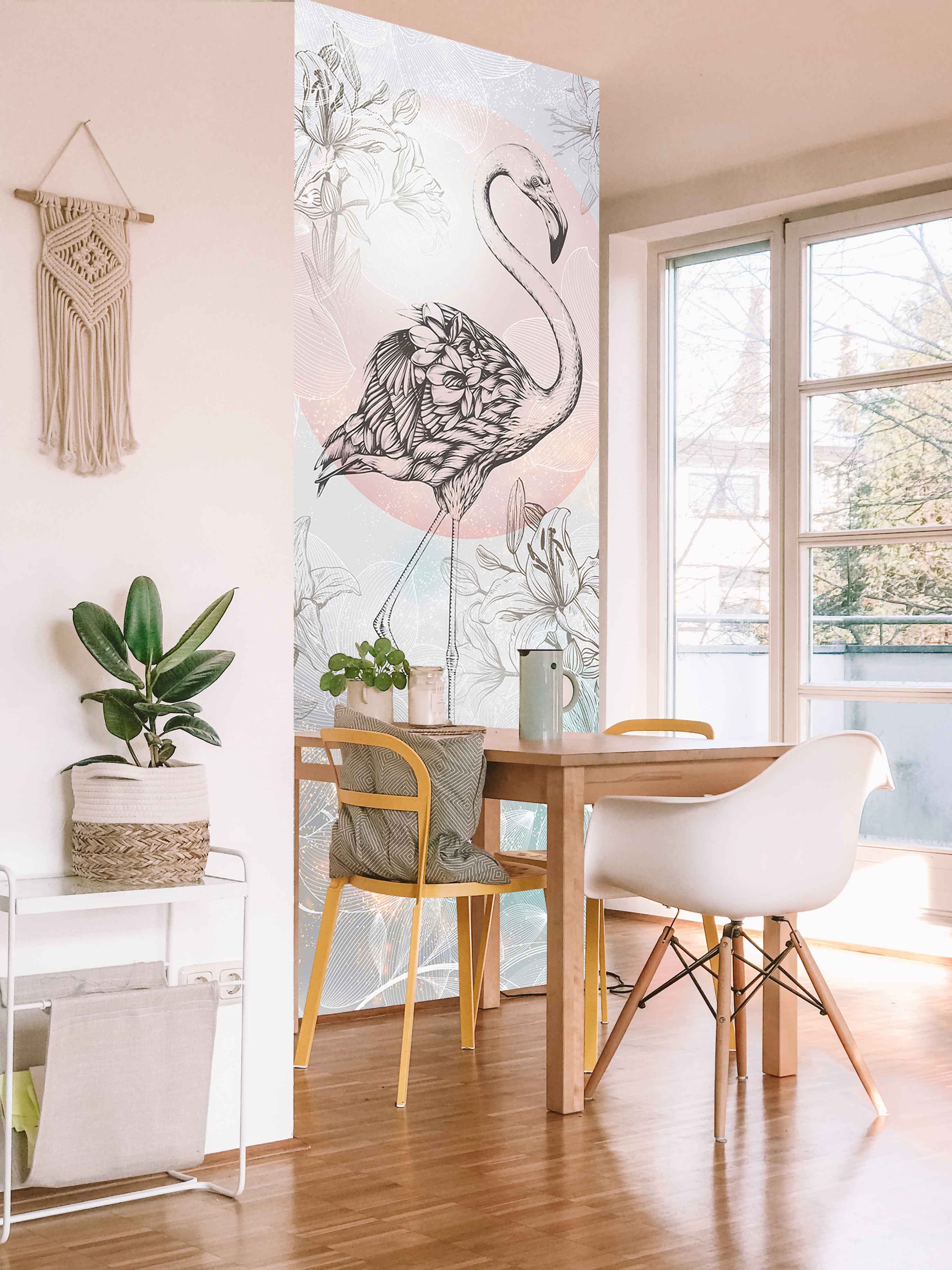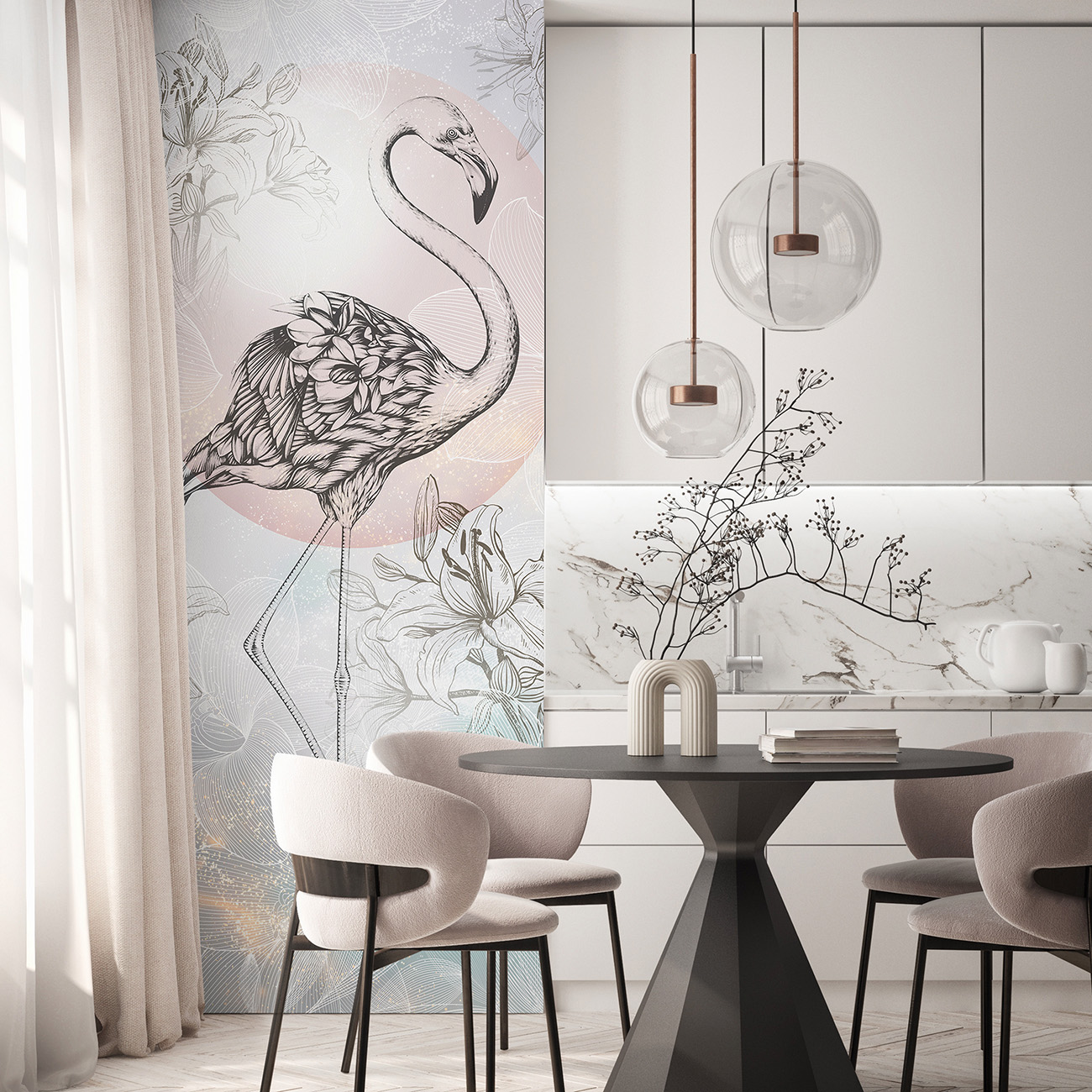 Наклеивайте на стену в очерёдности указанной на этикетке. Приложите фрагмент к стене и аккуратно разгладьте, выровняв и отцентрировав полотно по разметке. Для разглаживания рекомендуется использовать прижимной резиновый валик для обоев. Остатки клея удалите влажной тканью, излишки полотна срежьте острым ножом по линейке. Не допускается использование металлических и пластиковых шпателей! Следующий фрагмент наклейте встык. Аккуратно разгладьте стыки полотен без сильного нажима и трения, чтобы не повредить края.Фотообои F-227 "Фламинго" 100х270 - Характеристики