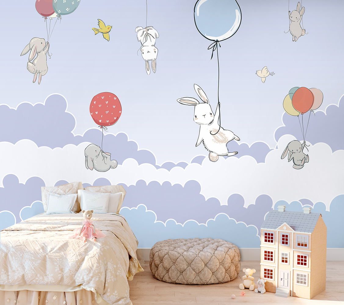 Описание Фотообои F-357 "Зайки в небе пастельные тона" 300х270