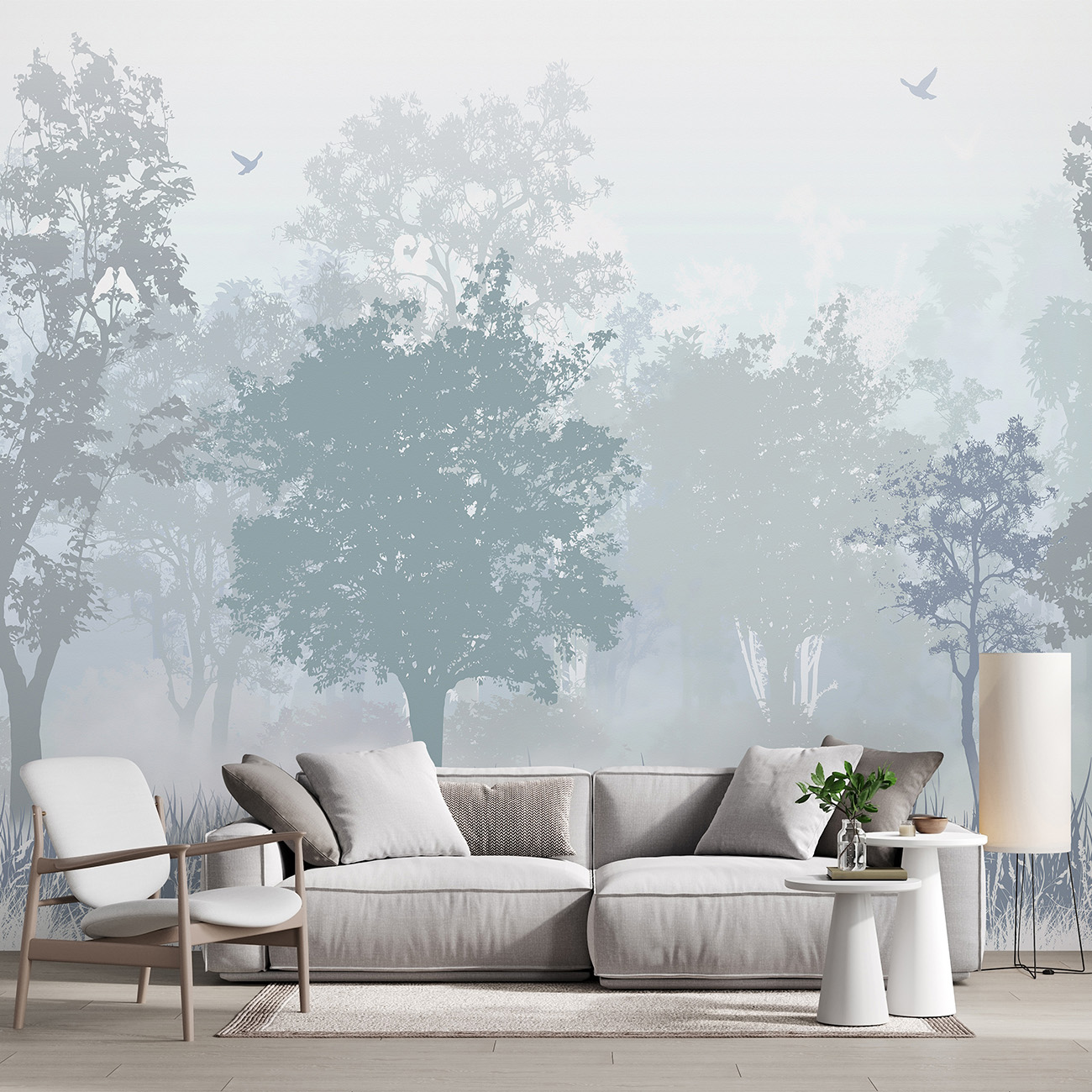 Наклеивайте на стену в очерёдности указанной на этикетке. Приложите фрагмент к стене и аккуратно разгладьте, выровняв и отцентрировав полотно по разметке. Для разглаживания рекомендуется использовать прижимной резиновый валик для обоев. Остатки клея удалите влажной тканью, излишки полотна срежьте острым ножом по линейке. Не допускается использование металлических и пластиковых шпателей! Следующий фрагмент наклейте встык. Аккуратно разгладьте стыки полотен без сильного нажима и трения, чтобы не повредить края.Фотообои F-403 "Голубой лес в тумане" 400х270 - Характеристики