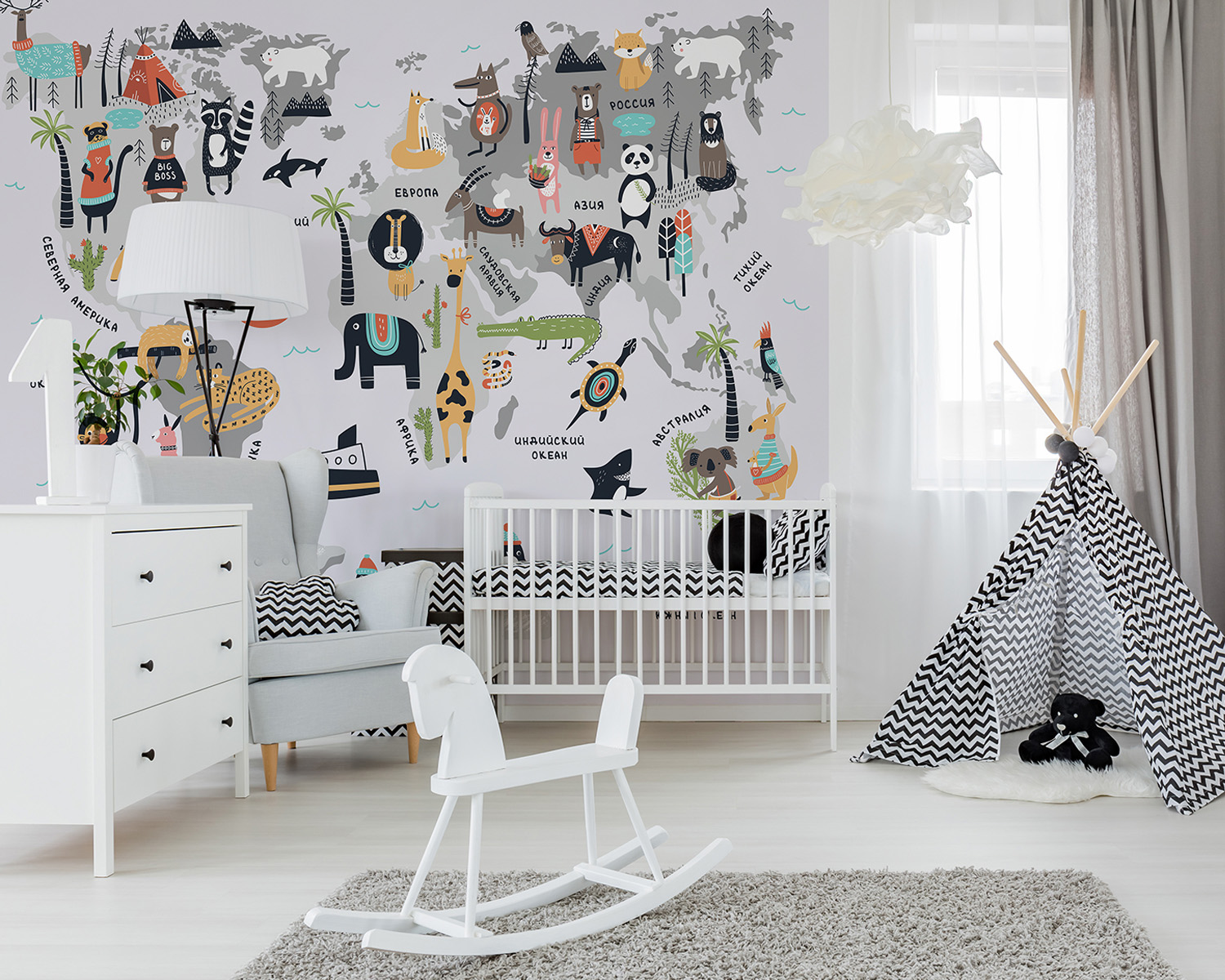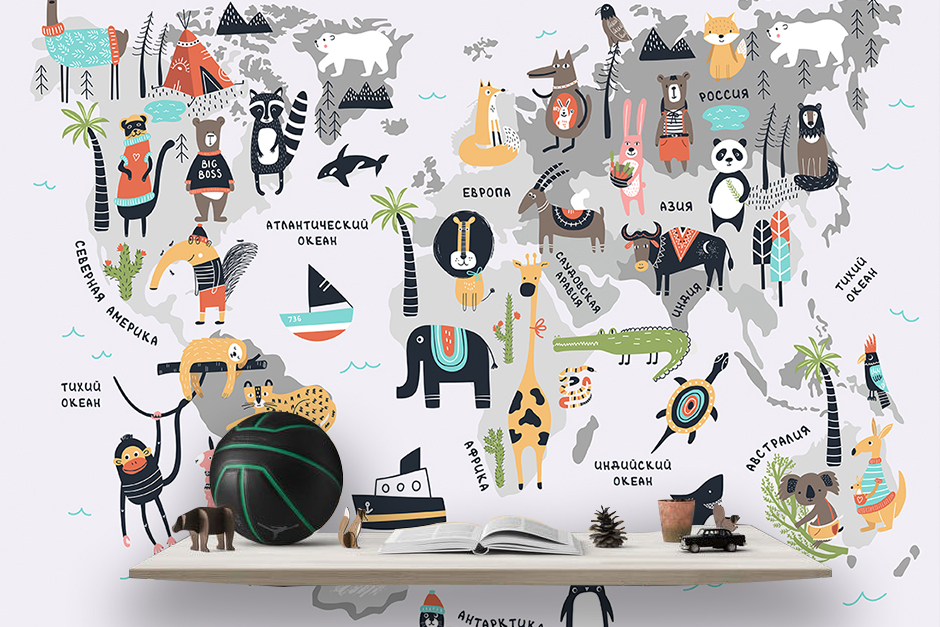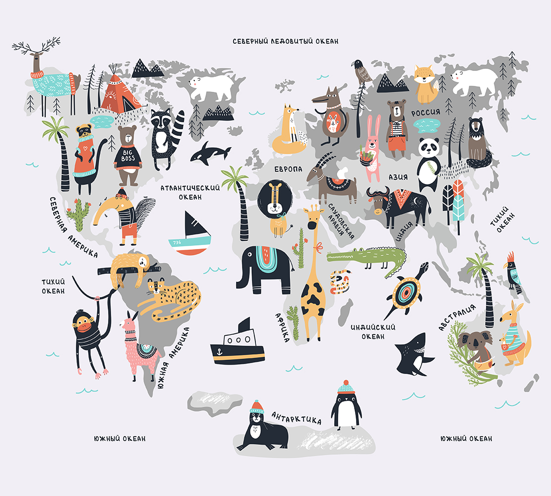 Фотообои T-123 "Карта мира с животными" 300х270 - Отзывы покупателей, пациентов, врачей