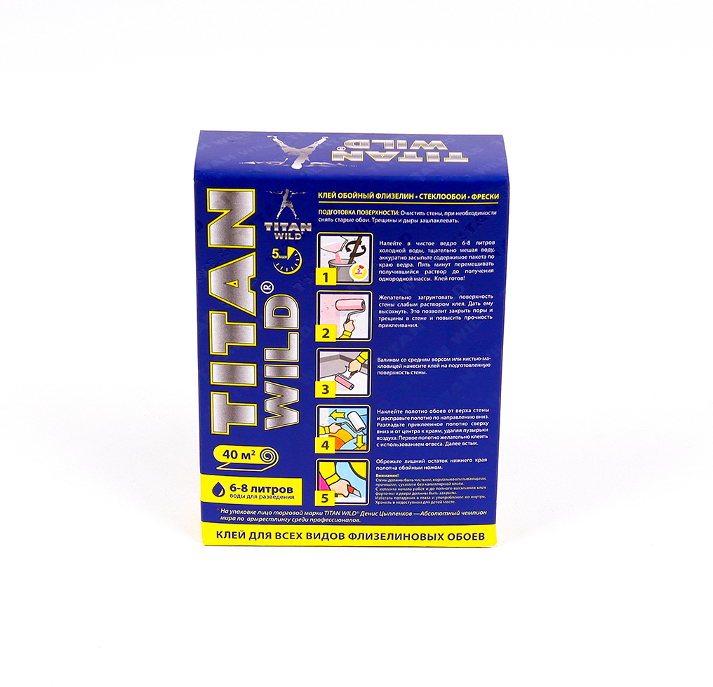 Наклеивайте на стену в очерёдности указанной на этикетке. Приложите фрагмент к стене и аккуратно разгладьте, выровняв и отцентрировав полотно по разметке. Для разглаживания рекомендуется использовать прижимной резиновый валик для обоев. Остатки клея удалите влажной тканью, излишки полотна срежьте острым ножом по линейке. Не допускается использование металлических и пластиковых шпателей! Следующий фрагмент наклейте встык. Аккуратно разгладьте стыки полотен без сильного нажима и трения, чтобы не повредить края.Клей Titan Wild обойный флизелиновый 350 гр - Характеристики